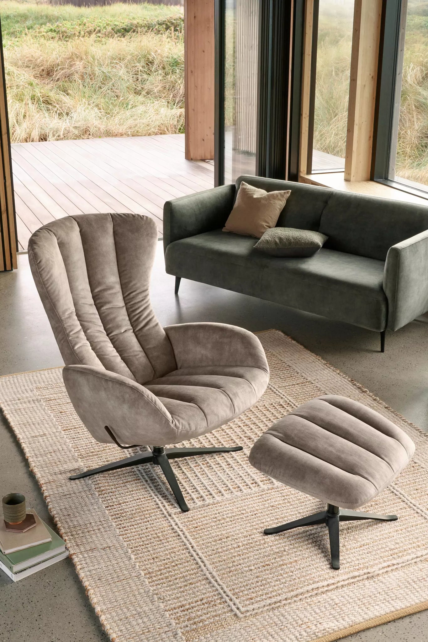 Reposapiés Tilburg, tela Ravello arena 3220/estructura lacada negro mate. A43xL59xF49cm.